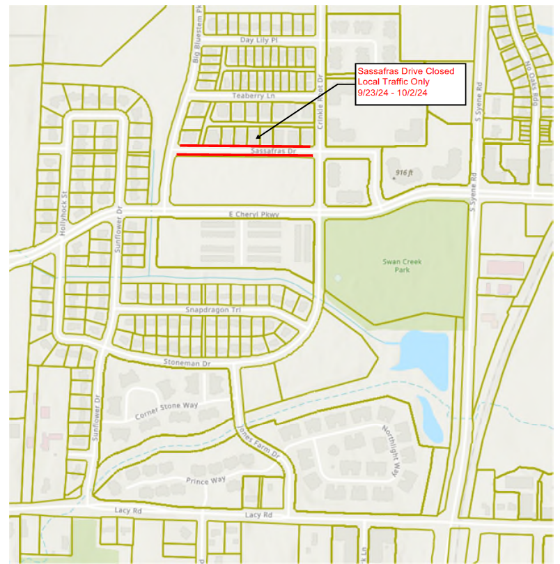 Sassafras Drive will be closed from Big Bluestem Parkway to Crinkle Root Drive starting Monday, September 23, 2024, through Wednesday, October 2, 2024, to accommodate utility installations.  Please see the map for location of this closure.