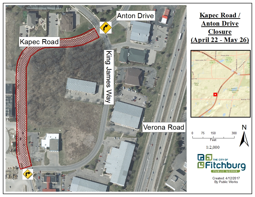 Kapec Road will be closed from approximately 900 ft. north of CTH PD to the intersection of Kapec Rd., Anton Dr., and King James Way. The closure starts Saturday, April 22nd and will last approximately 35 days.
