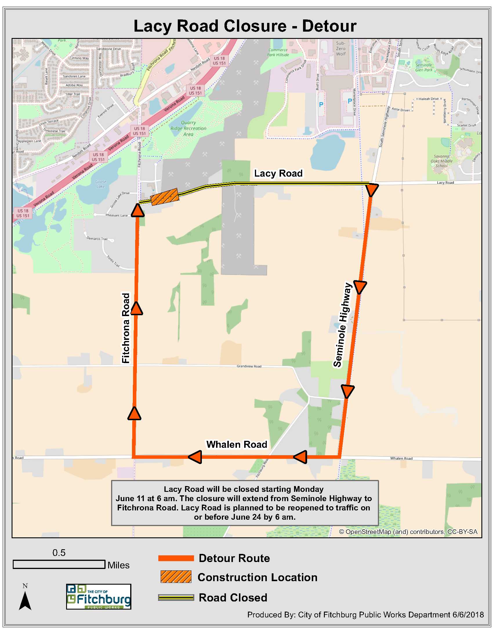 A signed detour will be in place during this time to route traffic around the construction on Seminole Highway - Whalen Road - Fitchrona Road.  For questions regarding this road closure, please contact Bill Balke, (608) 270-4264, or bill.balke@fitchburgwi.gov