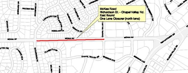 One of the two eastbound lanes on McKee Road, between Richardson Street and Chapel Valley Road, will be closed due to a water main break on June 26, 2019 starting at 9:00 a.m. This lane will remain closed until repairs are made. Traffic is able to proceed through this area, however there may be delays. If possible, please use other routes.
