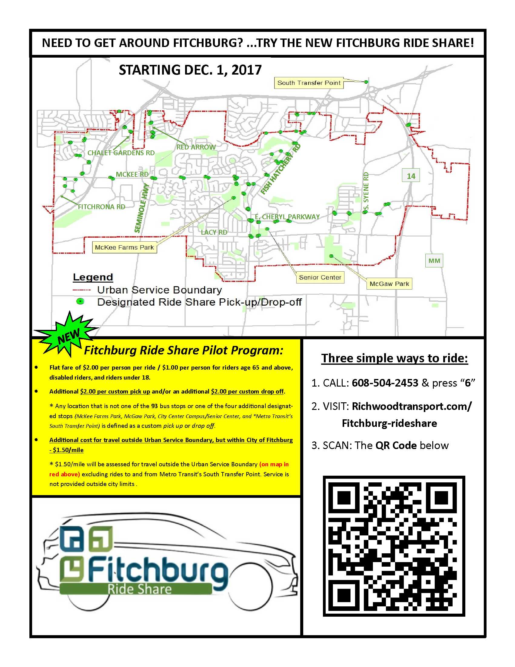 The Fitchburg Ride Share Pilot Program will begin December 1st. See link for additional information, including map of service area.